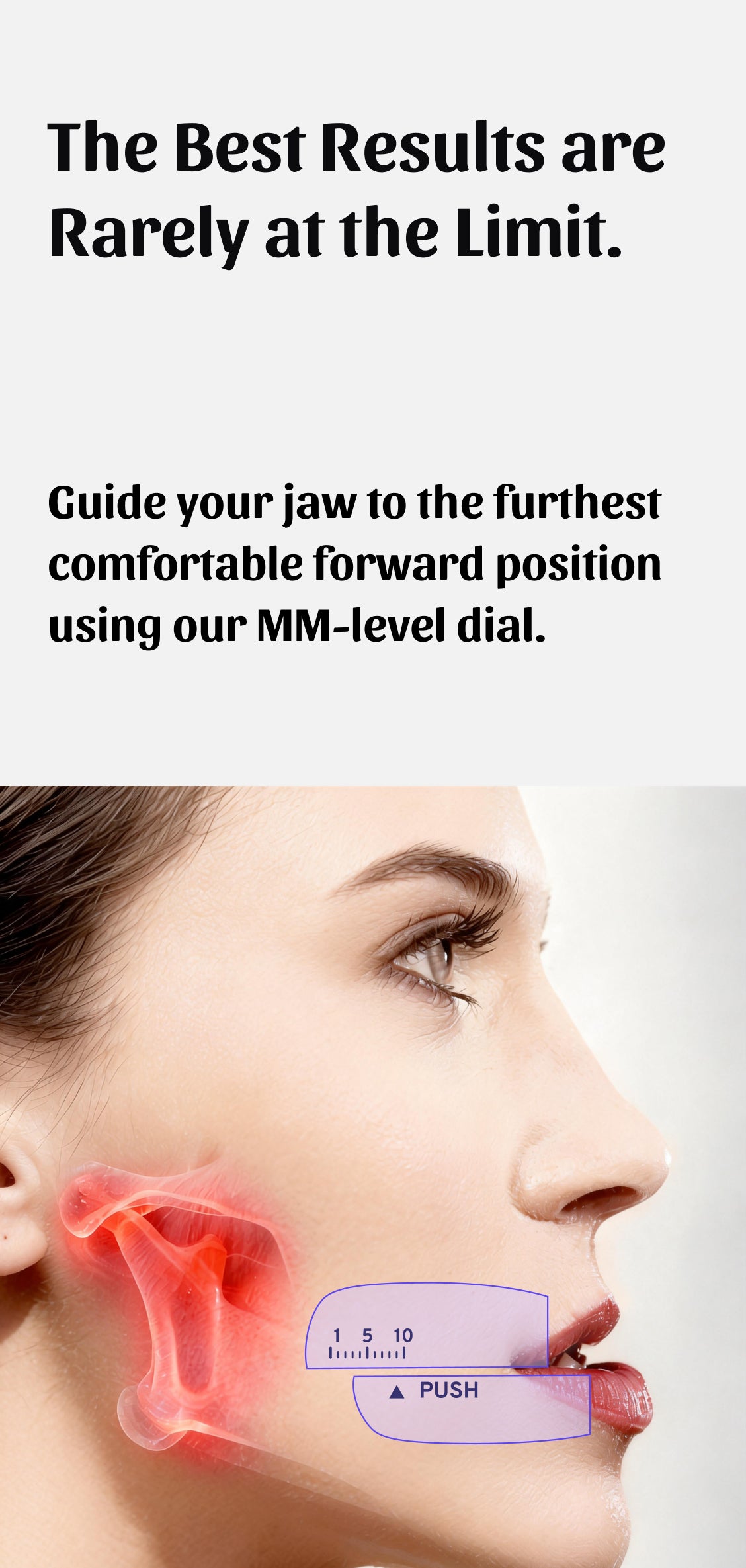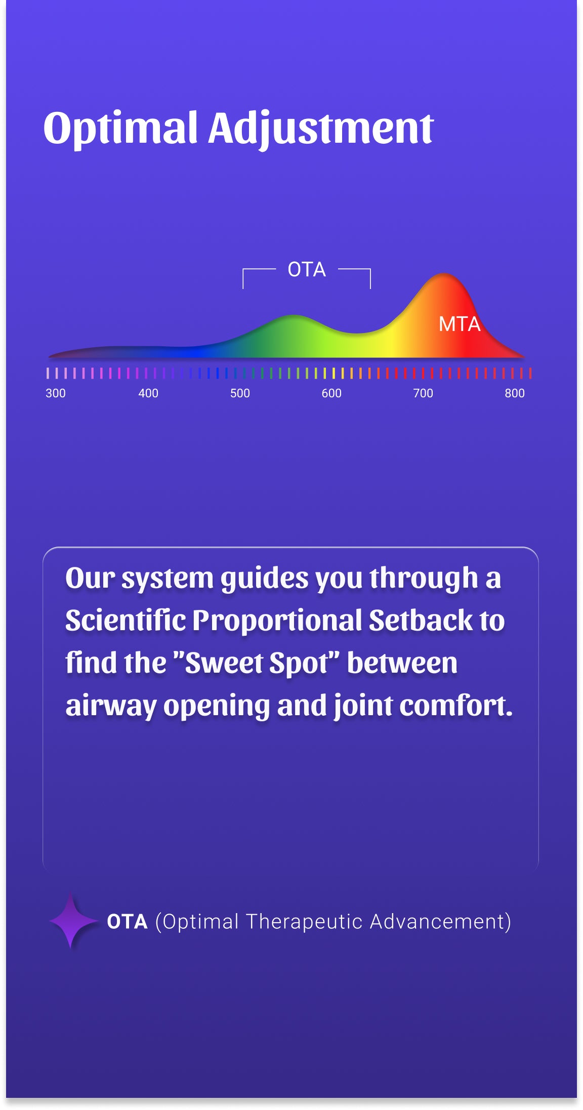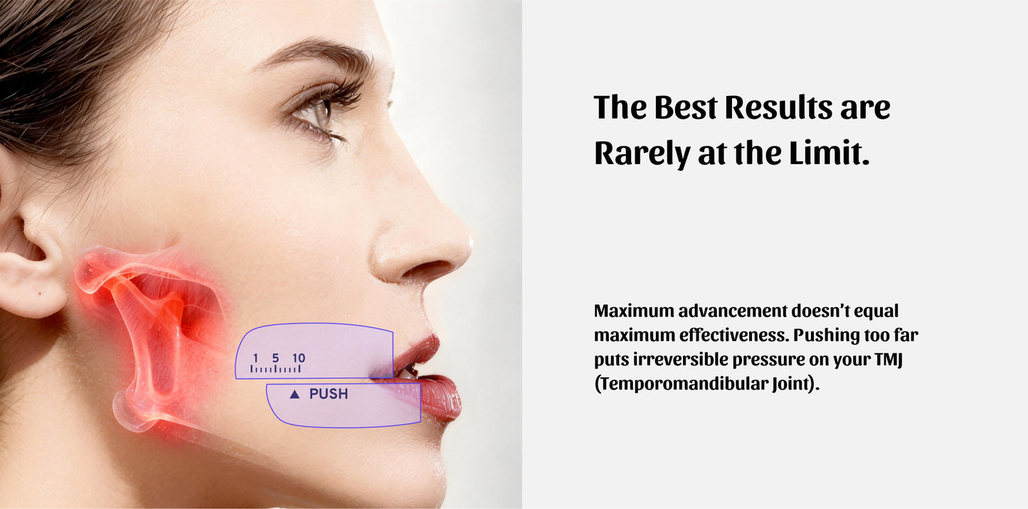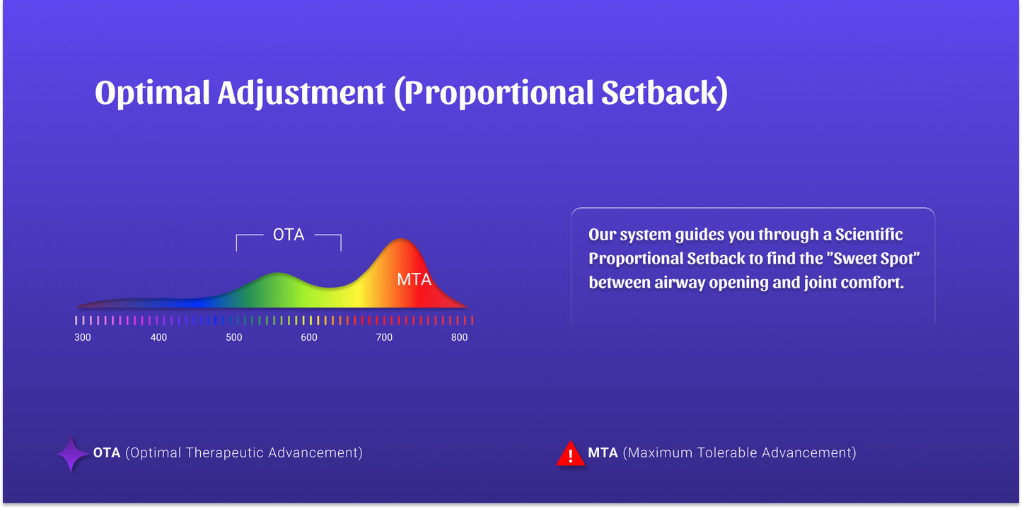 We use the Proportional Setback Method: 1. Find your Maximum Tolerable Advancement (MTA); 2. Follow our guided Proportional Setback to lock your Optimal Therapeutic Advancement (OTA). This ensures airway support while protecting your TMJ.